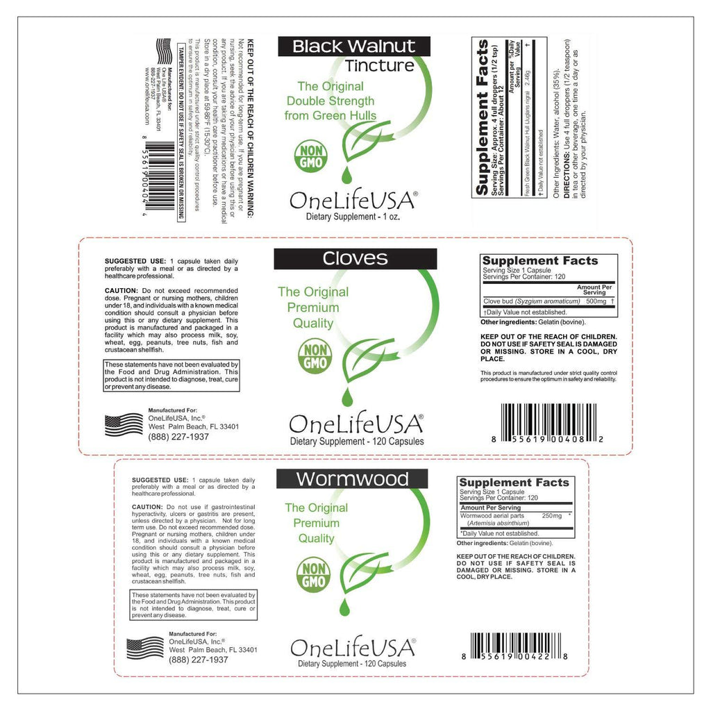 Pure Cloves and Wormwood plus extra strength Black Walnut tincture (made from green hulls) all MicroBatch manufactured in FDA registered and GMP certified US labs. Product for 1 adult cleanse and 1 maintenance cycles.