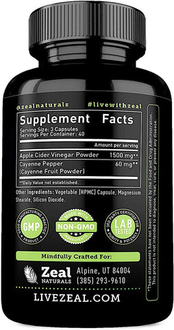 1560 MG ACV | 60 MG CAYENNE | 120 CAPSULES - Get the most out of your apple cider vinegar diet pills with 1500 mg of pure acv, 60 mg of cayenne pepper and 120 capsules! Don't waste your money on cheap and ineffective supplements that give you minimal servings and don't have enough apple cider vinegar to be effective.